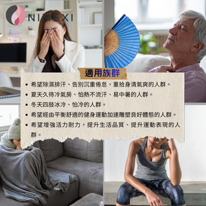 - ❄️ 夏季久待冷氣房族:長時間處於冷氣環境、怕熱不易流汗、容易感到不適或疲憊的人群。
